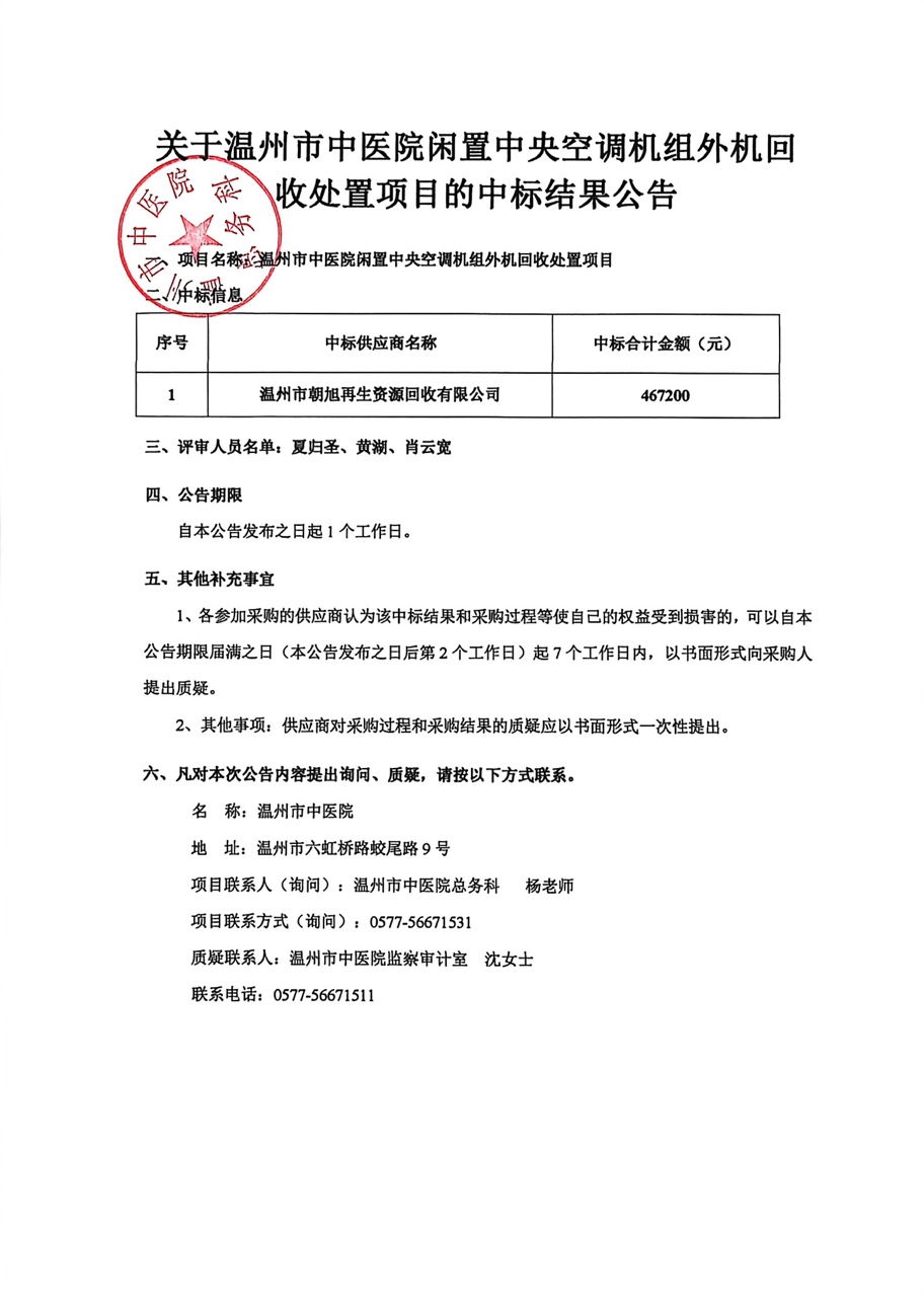 温州市中医院闲置中央空调机组外机回收处置项目的中标结果公告