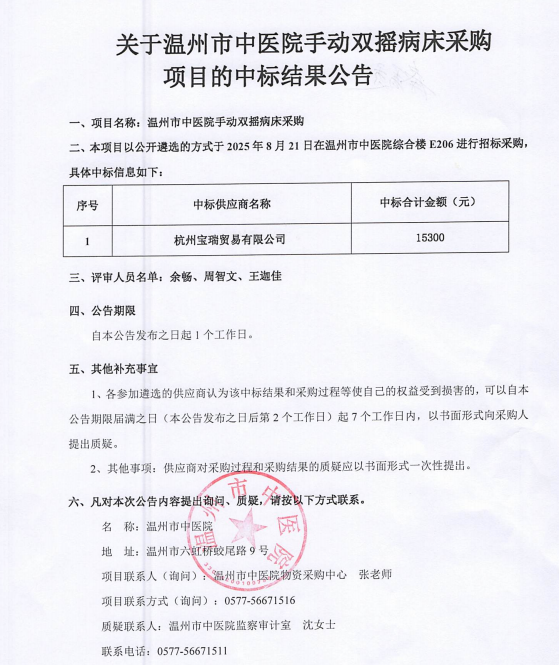关于温州市中医院手动双摇病床采购项目的中标(成交)结果公告
