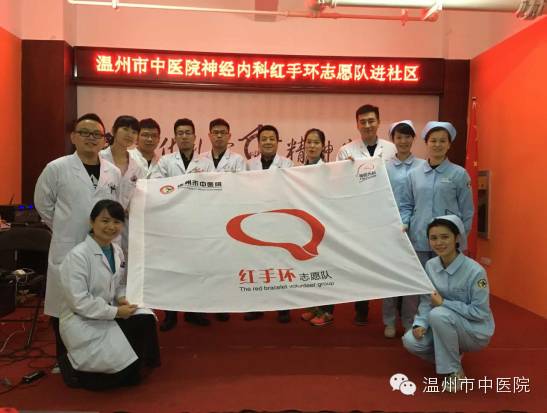 温州市中医院神经内科红手环志愿服务队是温州地区率先成立的“红手环志愿者服务团”,由具备多年脑卒中临床经验的神经内科医护人员组成,他们经验丰富,青春阳光,真诚睿智。红手环医务志愿者严格践行“坚定执着、无私奉献、守护健康、服务社会”的红手环精神,与神经内科科普讲师团并轨活动,把防治卒中的科学理念和知识播散到全社会、广大群众中去,使卒中患者能够真正地被“早发现、早识别、早治疗”,共同为广大老百姓送去健康和幸福。