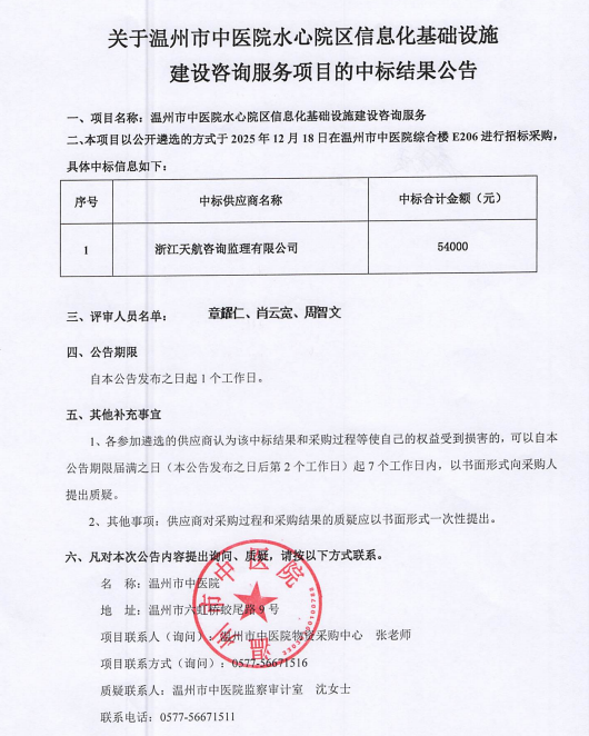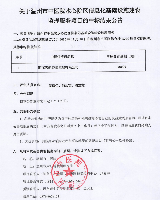 关于温州市中医院水心院区信息化基础设施建设监理服务项目的中标(成交)结果公告