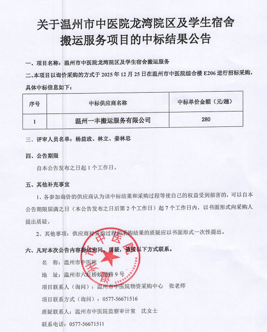 关于温州市中医院龙湾院区及学生宿舍搬运服务项目的中标(成交)结果公告