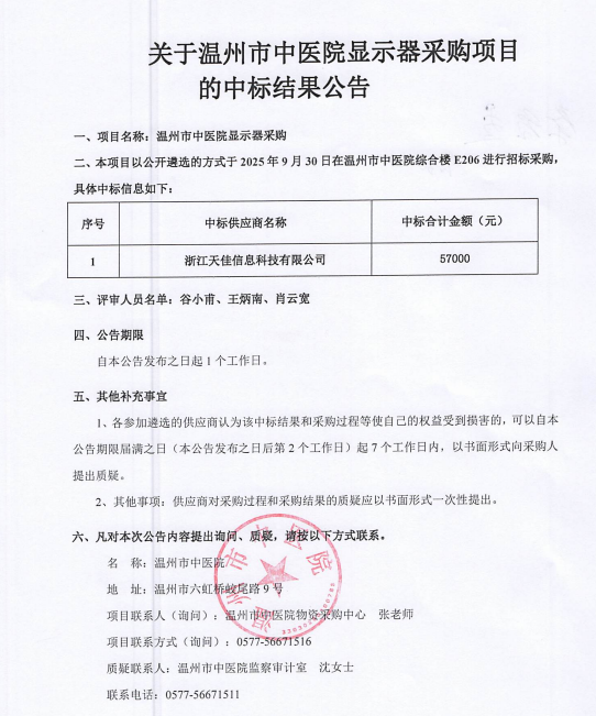 关于温州市中医院显示器采购项目的中标(成交)结果公告