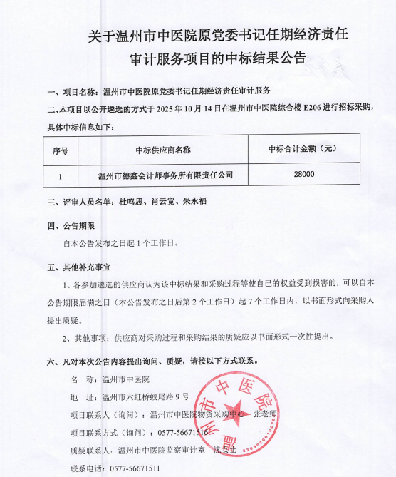 关于温州市中医院原党委书记任期经济责任审计服务项目的中标(成交)结果公告
