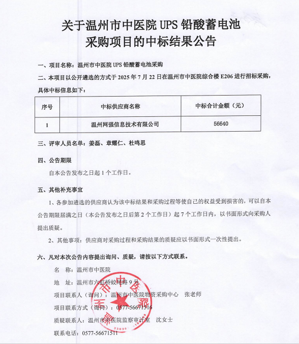 关于温州市中医院UPS铅酸蓄电池采购项目的中标(成交)结果公告