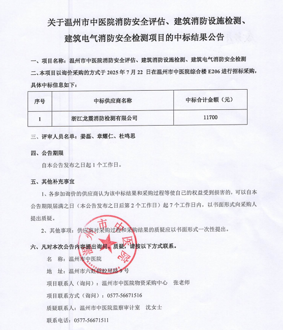 关于温州市中医院消防安全评估、建筑消防设施检测、建筑电气消防安全检测项目的中标(成交)结果公告