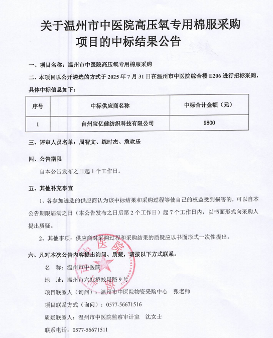 关于温州市中医院高压氧专用棉服采购项目的中标(成交)结果公告