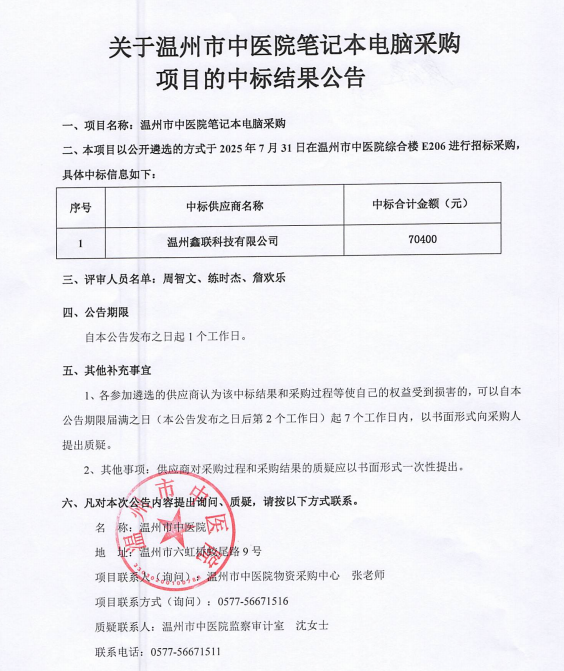 关于温州市中医院笔记本电脑采购项目的中标(成交)结果公告
