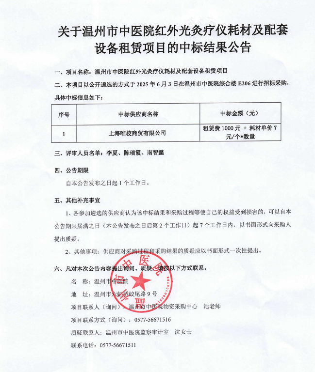 温州市中医院红外光灸疗仪耗材及配套设备租赁项目中标公告(二)