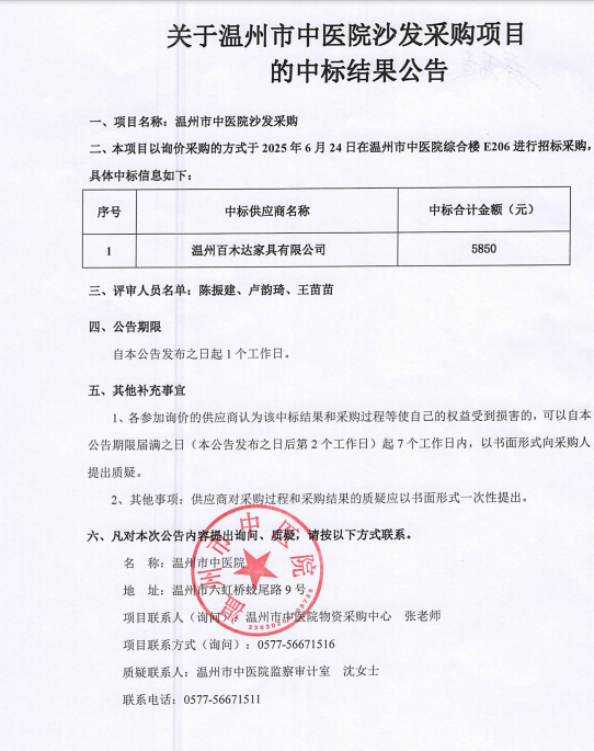 关于温州市中医院沙发采购项目的中标(成交)结果公告
