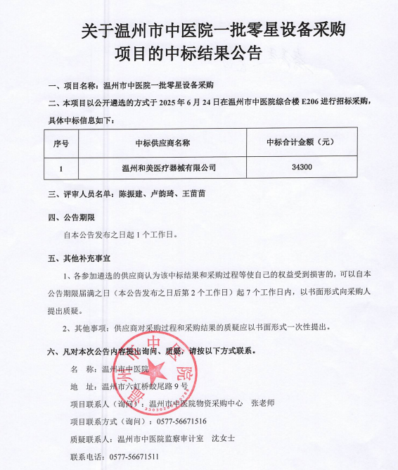 关于温州市中医院一批零星设备采购项目的中标(成交)结果公告