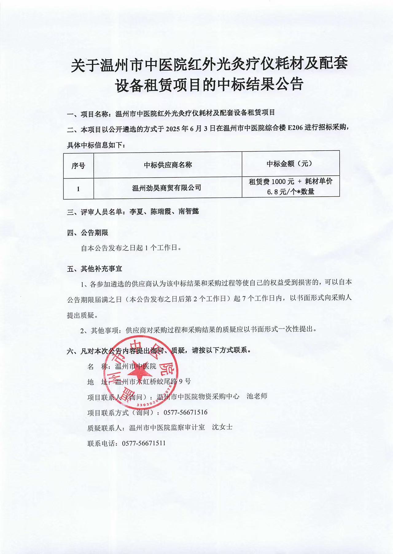 温州市中医院红外光灸疗仪耗材及配套设备租赁项目中标公告