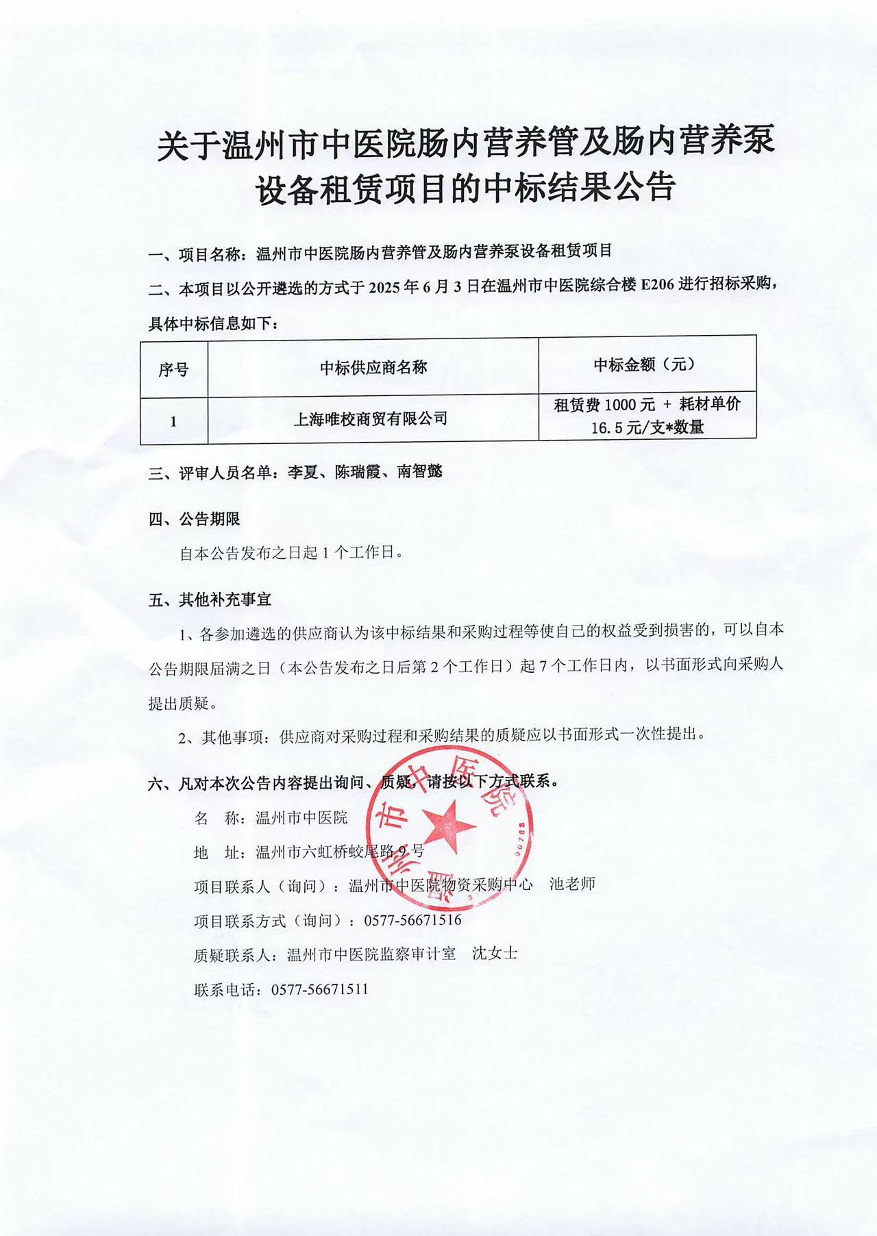 温州市中医院肠内营养管及肠内营养泵设备租赁项目中标公告