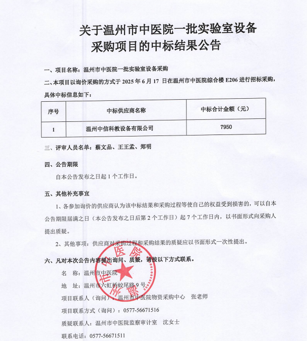 关于温州市中医院一批实验室设备采购项目的中标(成交)结果公告