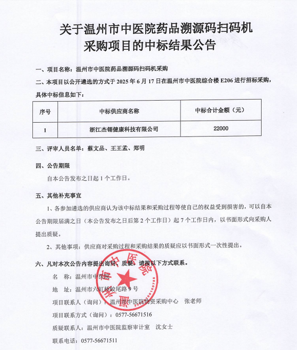 关于温州市中医院药品溯源码扫码机采购项目的中标(成交)结果公告