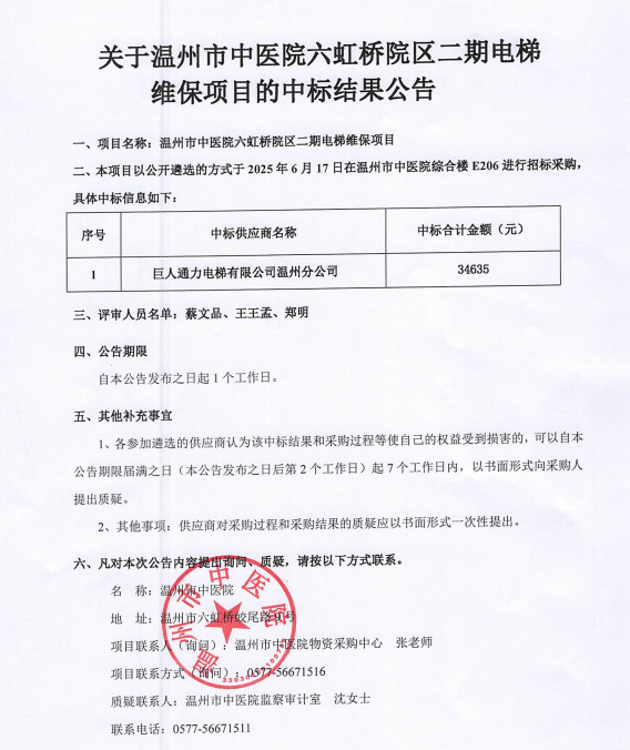 关于温州市中医院六虹桥院区二期电梯维保项目的中标(成交)结果公告