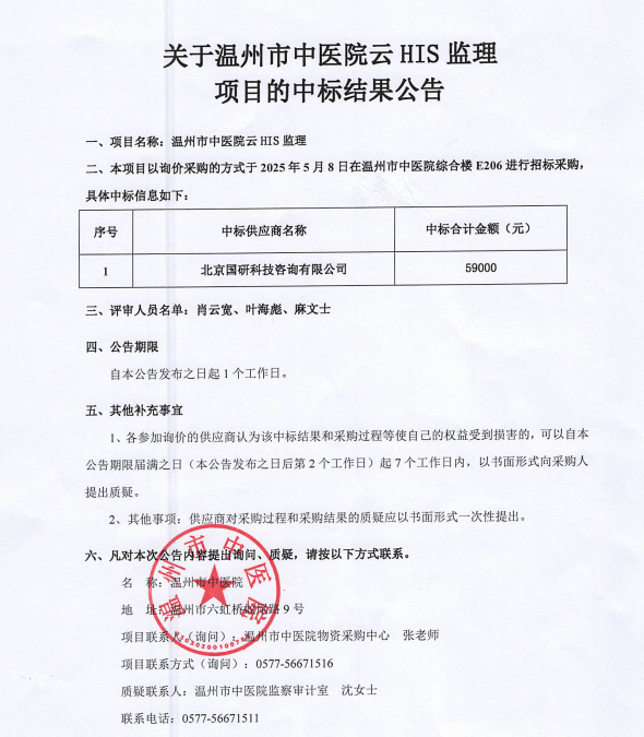 关于温州市中医院云HIS监理项目的中标(成交)结果公告