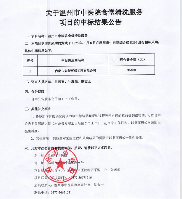 关于温州市中医院食堂清洗服务项目的中标(成交)结果公告