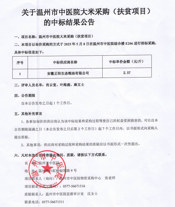 关于温州市中医院大米采购(扶贫项目)的中标(成交)结果公告
