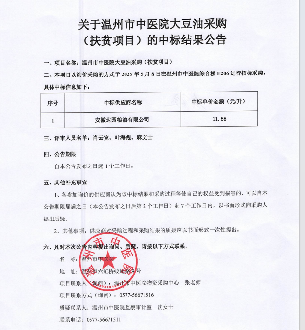 关于温州市中医院大豆油采购(扶贫项目)的中标(成交)结果公告