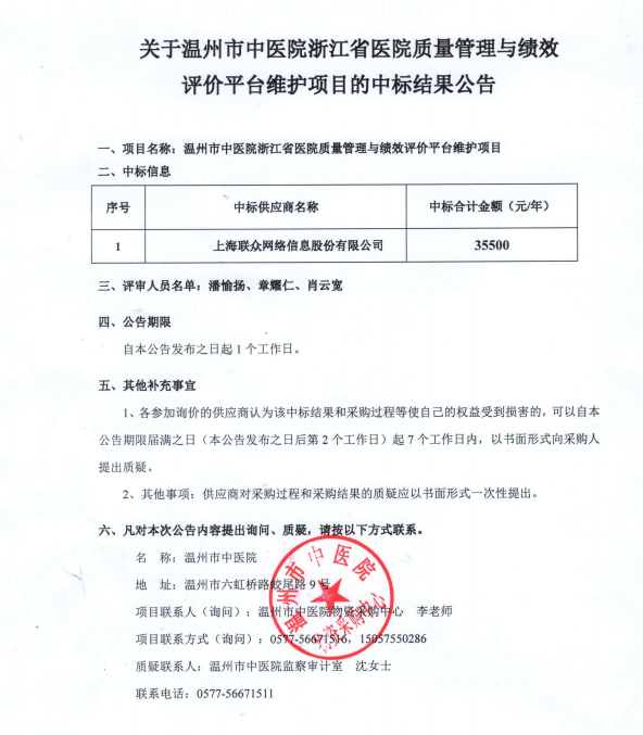 关于温州市中医院浙江省医院质量管理与绩效评价平台维护项目的中标(成交)结果公告