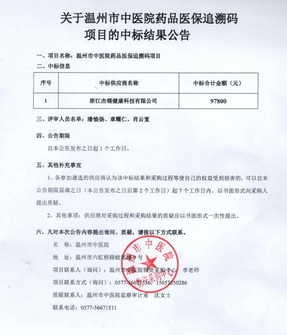 关于温州市中医院药品医保追溯码项目的中标(成交)结果公告