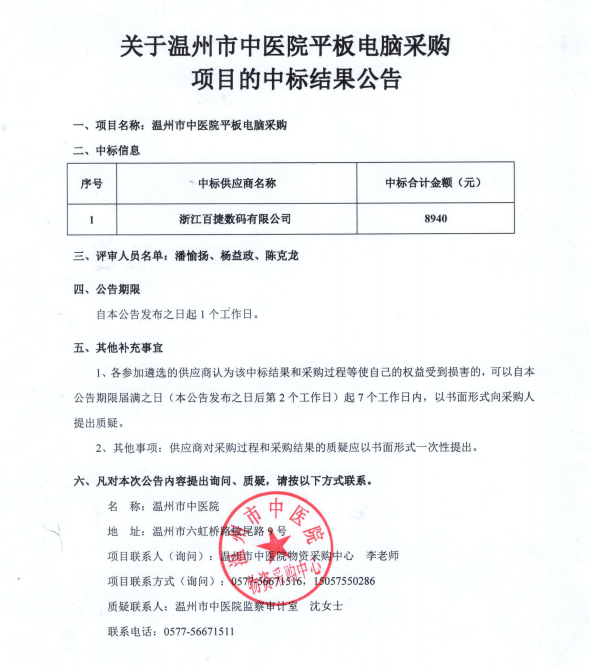 关于温州市中医院平板电脑采购项目的中标(成交)结果公告