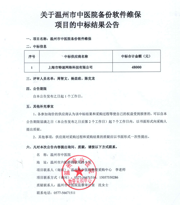 关于温州市中医院备份软件维保项目的中标(成交)结果公告