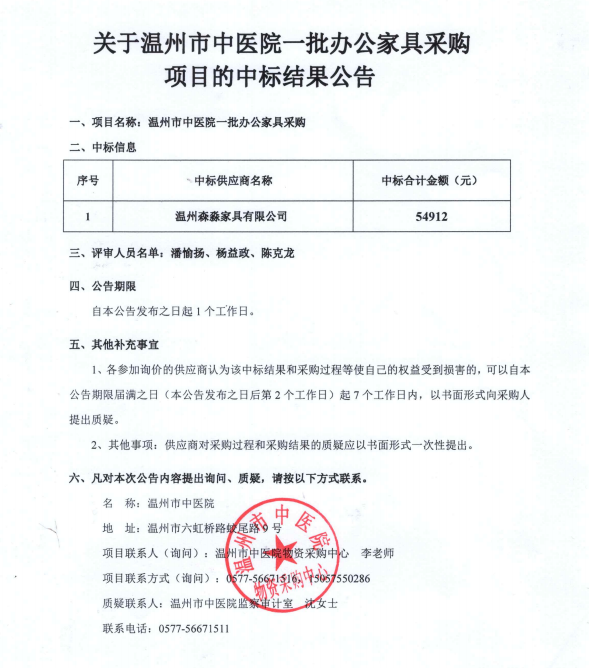 关于温州市中医院一批办公家具采购项目的中标(成交)结果公告