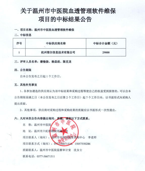 关于温州市中医院血透管理软件维保项目的中标(成交)结果公告