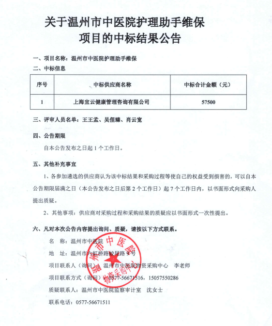 关于温州市中医院护理助手维保项目的中标(成交)结果公告