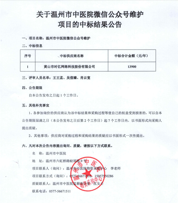 关于温州市中医院微信公众号维护项目的中标(成交)结果公告