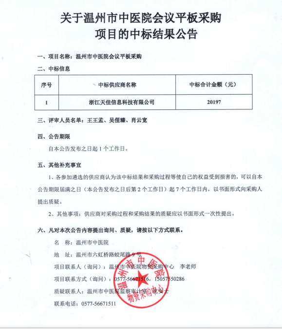 关于温州市中医院会议平板采购项目的中标(成交)结果公告