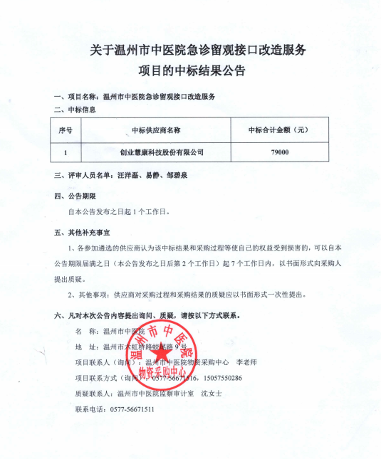 关于温州市中医院急诊留观接口改造服务(重)项目的中标(成交)结果公告