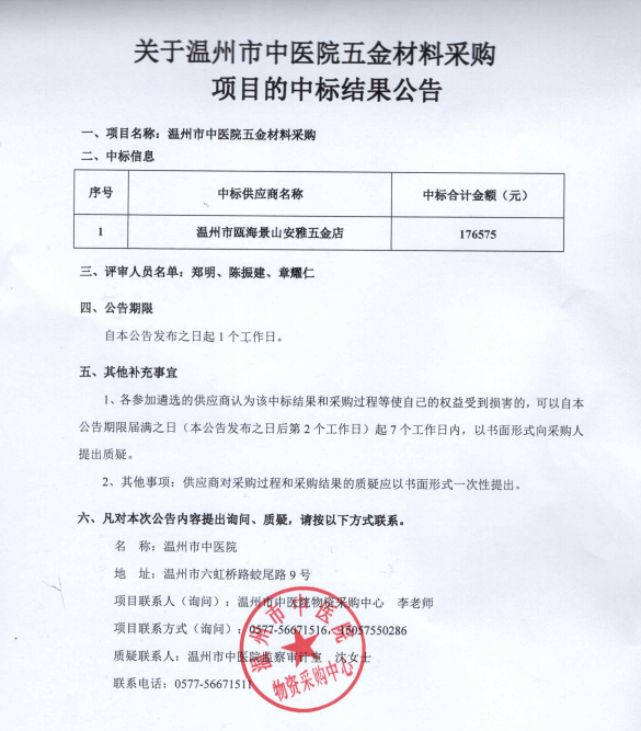关于温州市中医院五金材料采购项目(重)的中标(成交)结果公告