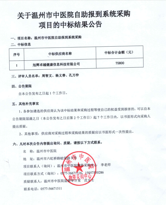 关于温州市中医院自助报到系统项目的中标(成交)结果公告