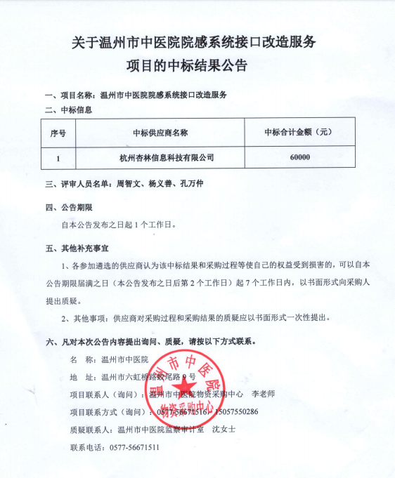 关于温州市中医院院感系统接口改造服务项目的中标(成交)结果公告