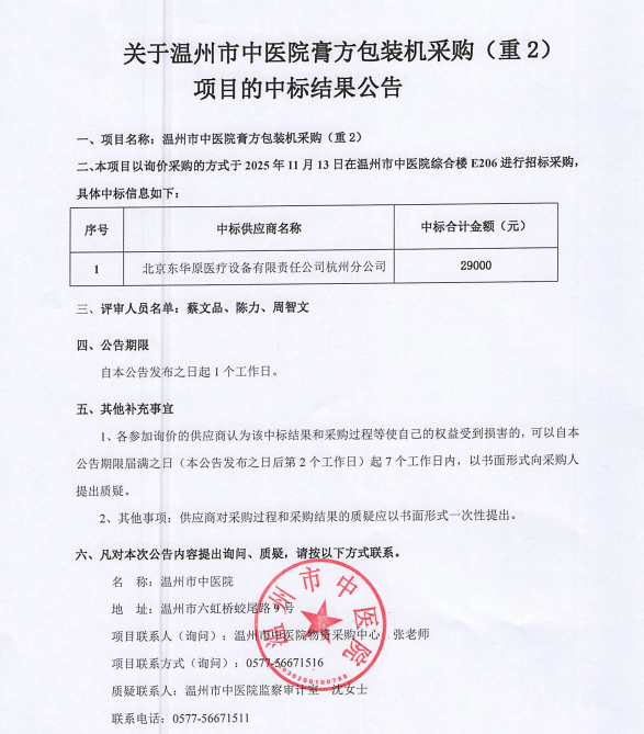 关于温州市中医院膏方包装机采购项目(重2)的中标(成交)结果公告