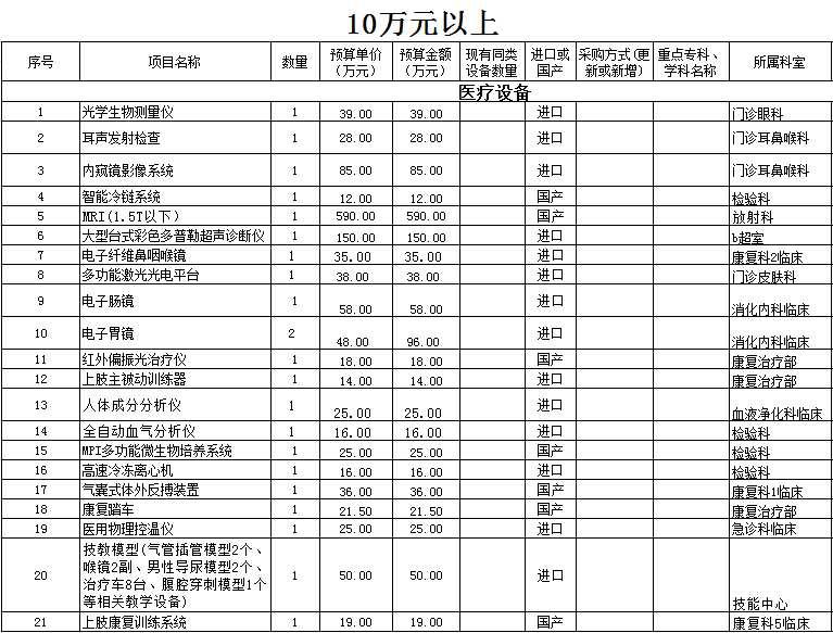 温州市中医院2021年医疗设备采购计划