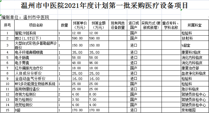 温州市中医院2021年医疗设备采购计划查看详情+