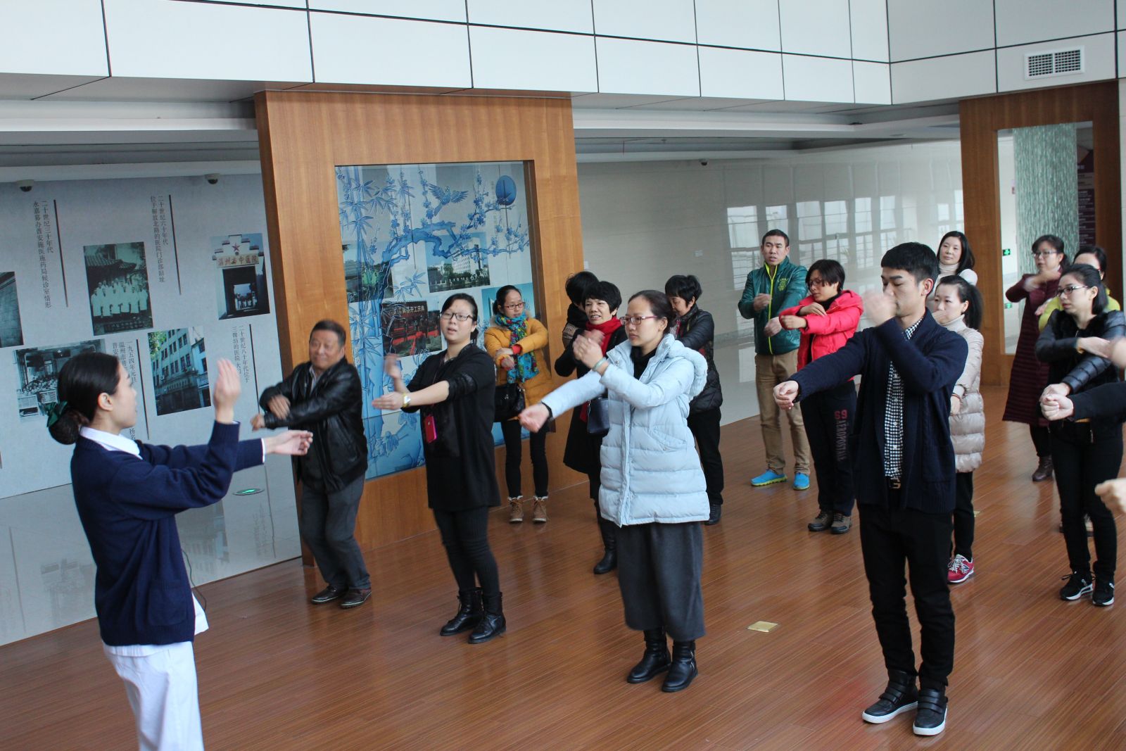 (学经络拍打操来保健——由门诊分诊护士带领大家做经络拍打操。拍打经络和穴位可以延年益寿。经络拍打操讲究“准”,所以大家都学得很认真)
