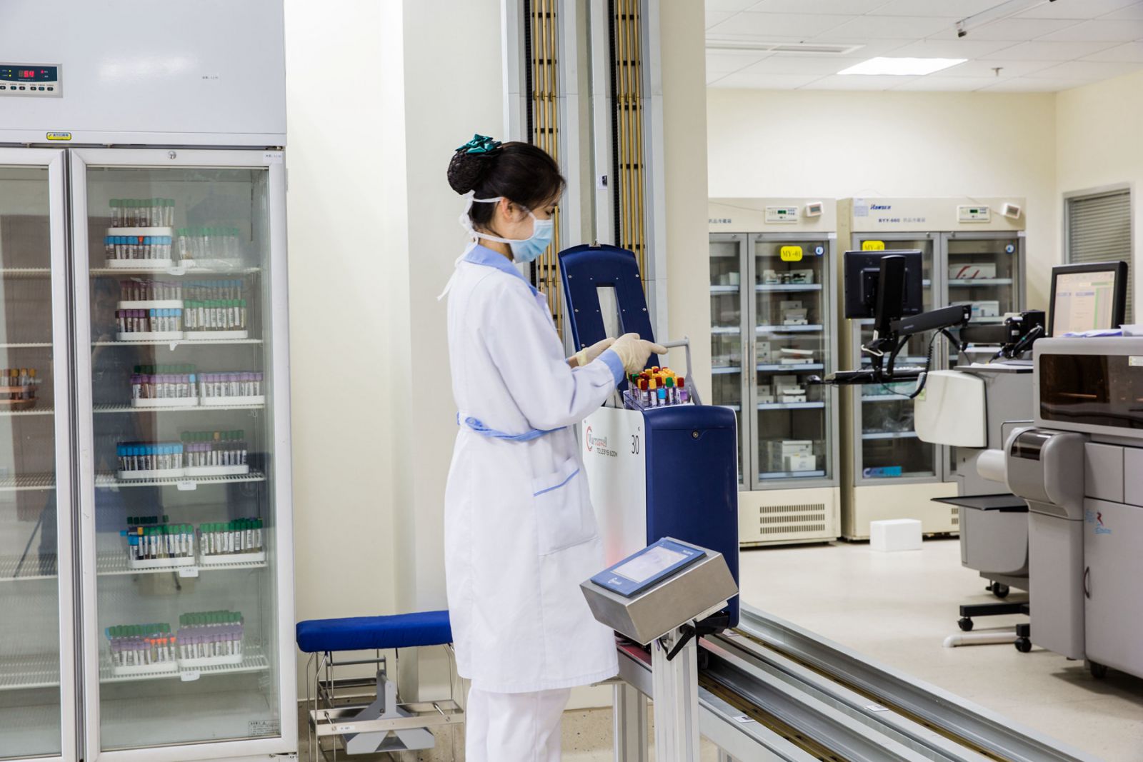 吴建锡副局长在门诊看到正在执行运输工作的物流小车,便觉新奇。黄建平院长介绍道,温州市中医院是我市医疗卫生系统中第一家启用智能轨道小车物流传输系统的,省医疗卫生系统包括我院在内目前也只有两家医院启用,它为医院改善就医环境,解决高峰时段大批量传输问题,减少科室重复建设发挥了重要作用。我院引进的运输小车单车载重为15KG,可传输静脉输液、血液制品、各种药品、小型手术包器械包、消毒辅料、检验病理标本、X光片、病历档案、各种单据和文件等。根据医院建筑结构布局,通过垂直和水平轨道将医院各科室、病区、管理部门连接起来,运输小车在计算机控制下,将物品按使用需求运送至目的地,大大提升了医院的物流管理水平,降低了运营成本,加快就医流程。