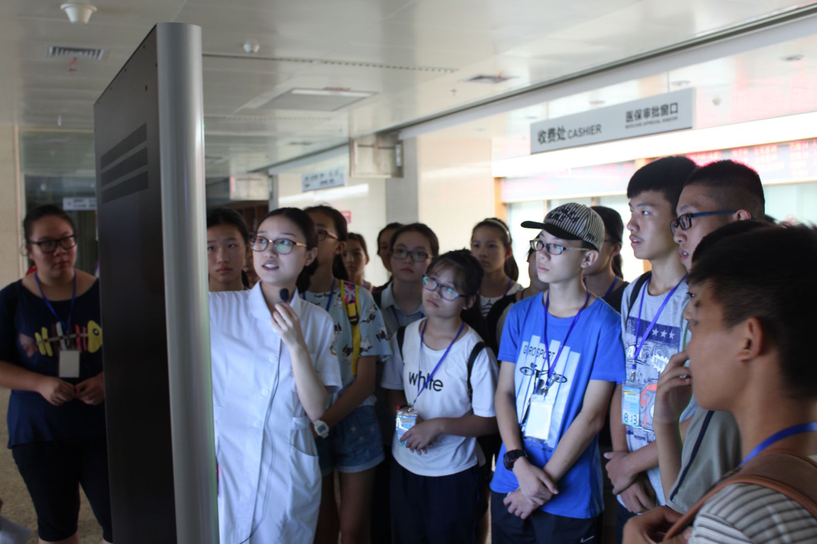 现代化新玩意令人称奇。门诊一楼大厅有两台特殊的机器——“智慧导诊机”,屏幕上是一张人体图,患者如果哪儿不舒服,就可以点击图片上的位置,会有若干症状的提示,建议看什么科,同学们都觉得很好奇,围在机器前体验了好久。同学们还参观了我院先进的物流系统,只要把需要送检的东西或者用到的药放在物流箱里,按下相应的开关,物流箱就会沿着指定的轨道到达目的地。还有自动发药机等先进的设备,都吸引了同学们的目光。