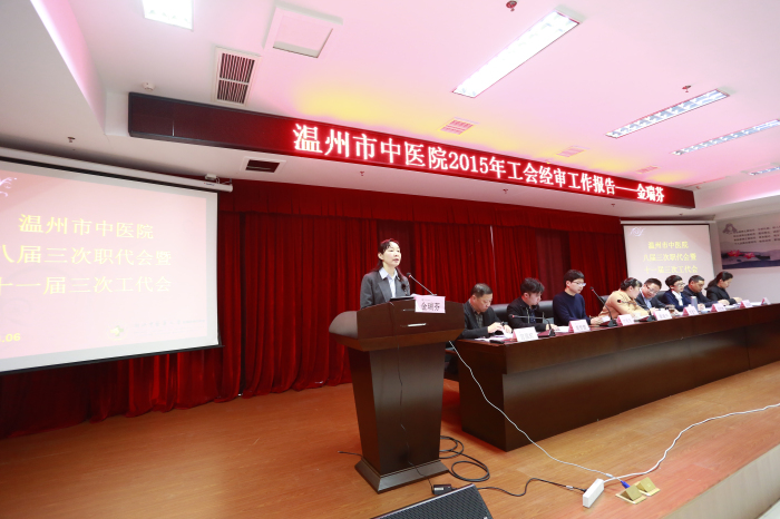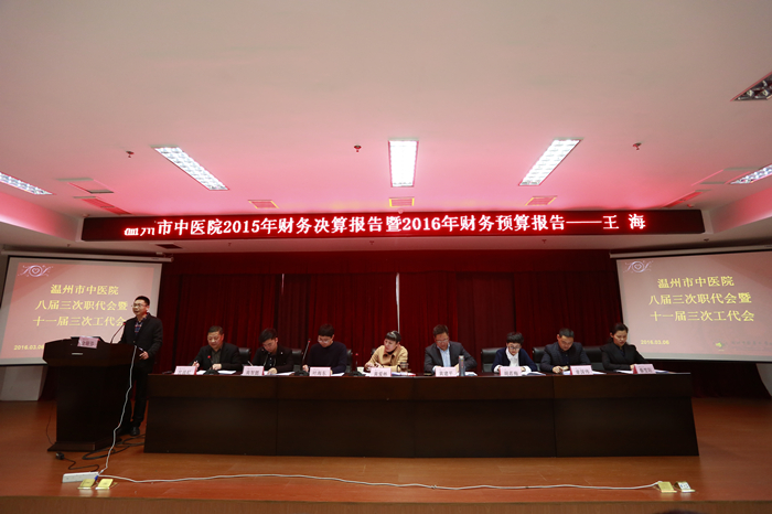 2016年3月6日上午,我院八届三次职代会暨十一届三次工代会在六虹桥院区召开。本次职代会,应参加正式代表111人,实到102人;列席代表56人,实到53人;特邀代表6人,实到6人。会议由医院工会主席黄爱林同志及副主席宫温虹同志分别主持。大会在庄严的国歌声中开幕,与会人员认真听取并审议通过了院长黄建平同志所作的《医院工作报告》和《医院“十三五”发展规划》(草案)、工会主席黄爱林同志作的《医院工会工作报告》、工会经审委员金瑞芬同志作的《医院2015年度工会经审工作报告》和财务科科长王海同志作的《医院2015年度财务决算暨2016年度财务预算报告》。