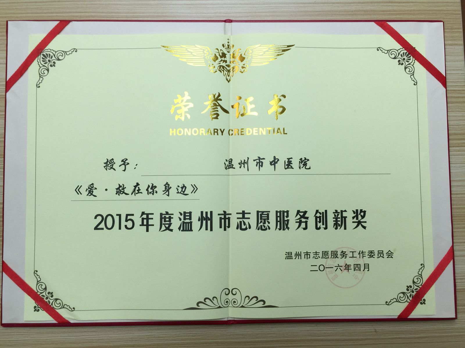 温州市志愿服务工作委员会表彰2015年度温州市志愿服务工作先进集体和个人的活动于2016年4月26日举行。我院普安志工的“爱·救在你身边”项目荣获“温州市志愿服务创新奖”,这是温州市卫生计生系统唯一获得此荣誉的项目。