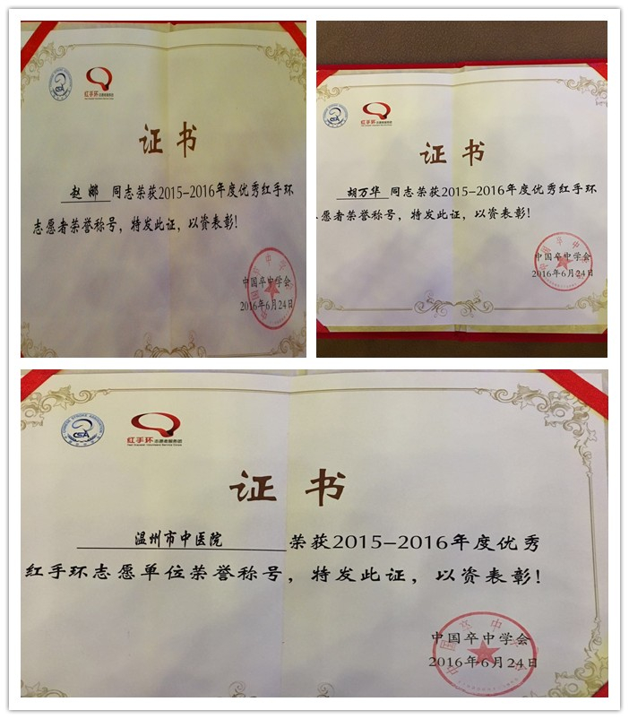 我院凭借出色的联盟工作和志愿服务荣获2015-2016年度“优秀红手环志愿单位”称号;医院胡万华主任、赵娜医师荣获“优秀红手环志愿者” 称号。目前,全国共有中国卒中中心联盟(CSCA)单位1500余家,红手环志愿服务团436家,志愿者人数超过15000人。本次共评选出优秀志愿单位92家。温州地区仅两家医院获此殊荣。