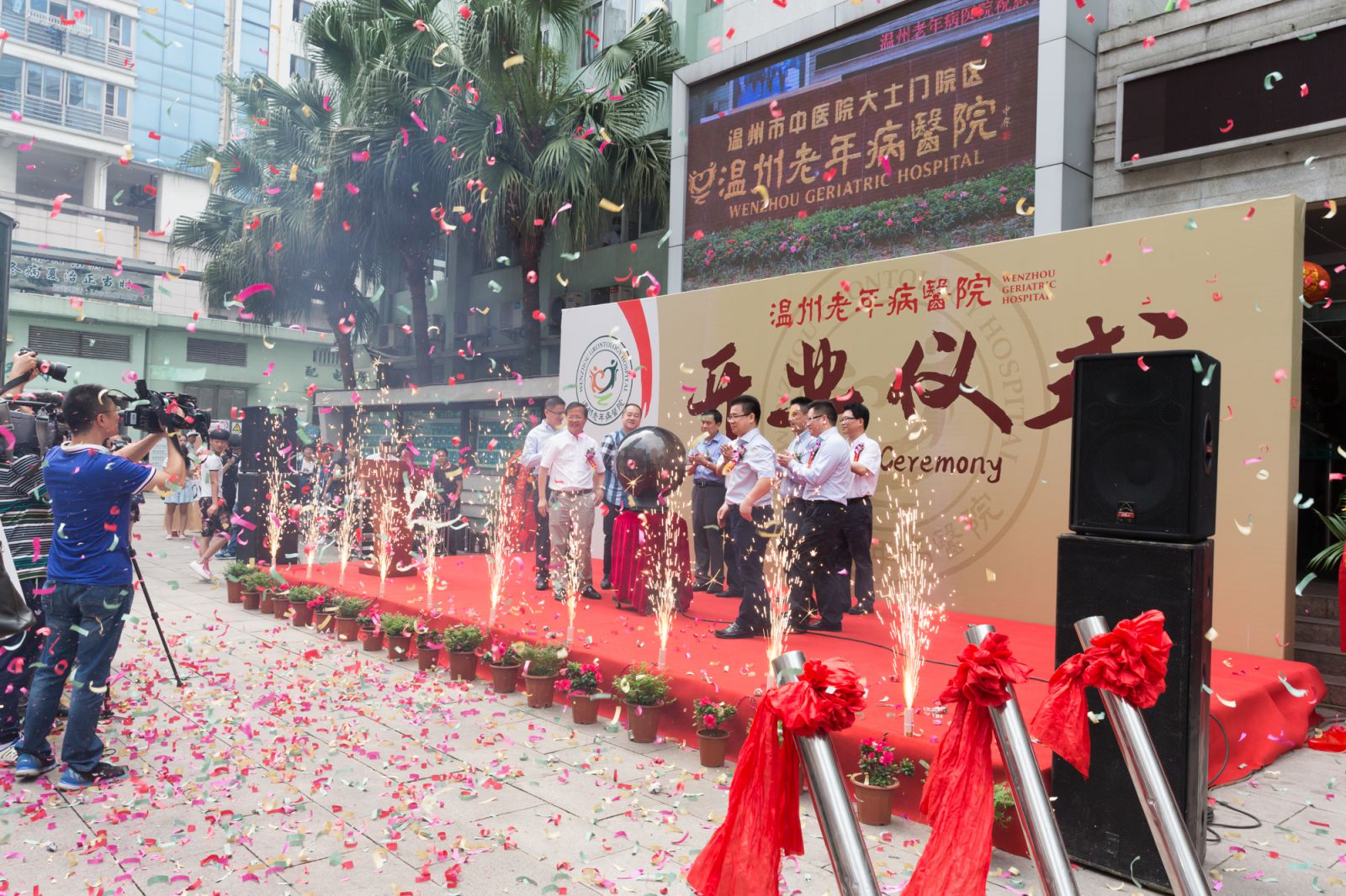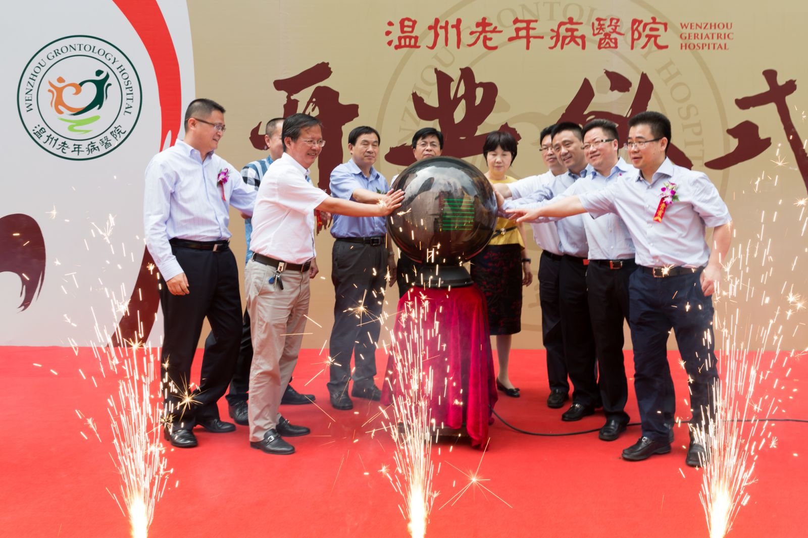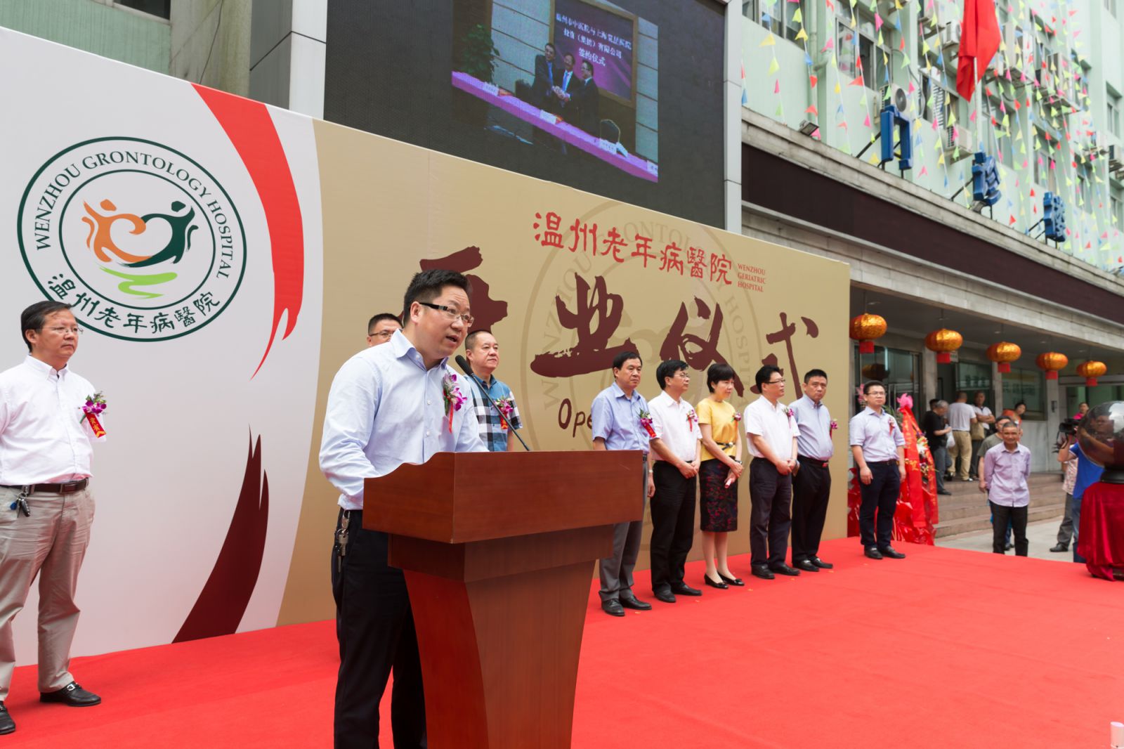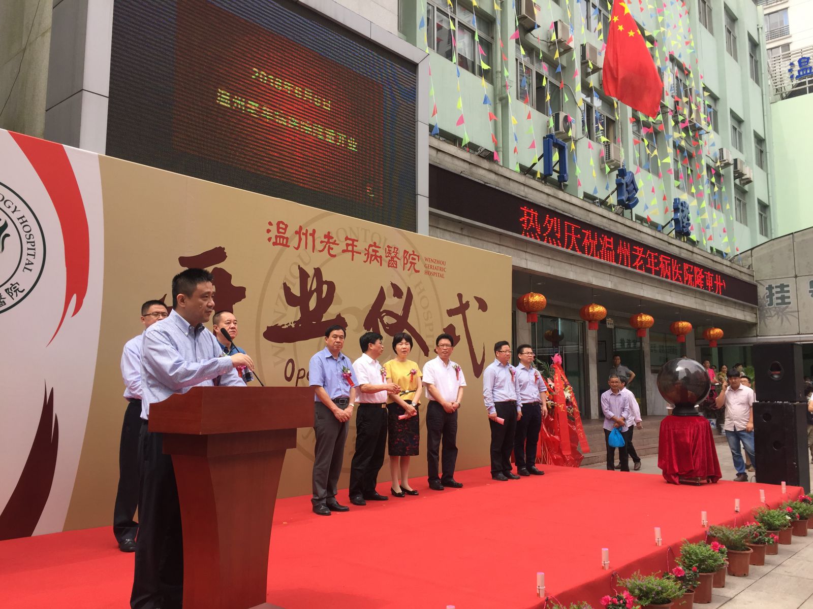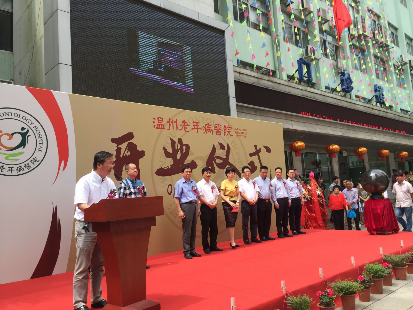 6月6日上午,温州老年病医院举行了开业仪式,出席仪式的嘉宾有:市人大副主任卓高柱、市人民政府副市长郑朝阳、市政协副主席夏克栋、市政府副秘书长叶世强、市卫生计生委主任程锦国、市卫生计生委副主任吴尚斌、市中医院院长黄建平及市政府有关部门,市卫计委相关处室,复星医药集团董事长陈启宇,复星医药集团副总裁、复星医院投资集团高级副总裁陈玉卿,复星医院投资集团总裁助理兼运营管理部总经理朱健华,省、市、县级兄弟单位,部分民营医院及温州中医医疗集团单位的代表。