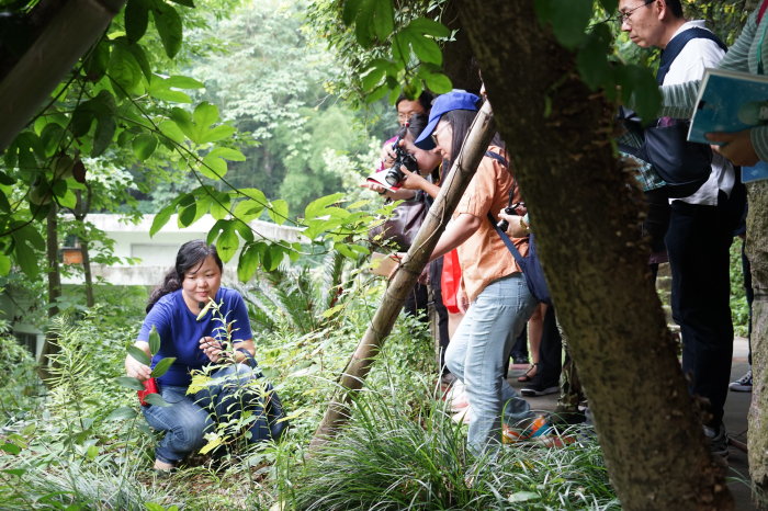 走出博物馆,在百草园内拾阶而上,每隔一米都能发现多种药材,在我院中药房主任朱雪梅的讲解下,垂盆草、金银花、鲜石斛、金钱草、木槿、薄荷……一种种中草药被识别出来。虽然没有专业的翻译,但是学生们兴趣丝毫不减,一边听讲解一边手拿相机拍个不停,更有不少学生现场提问,展现出对中医药文化的浓厚兴趣。