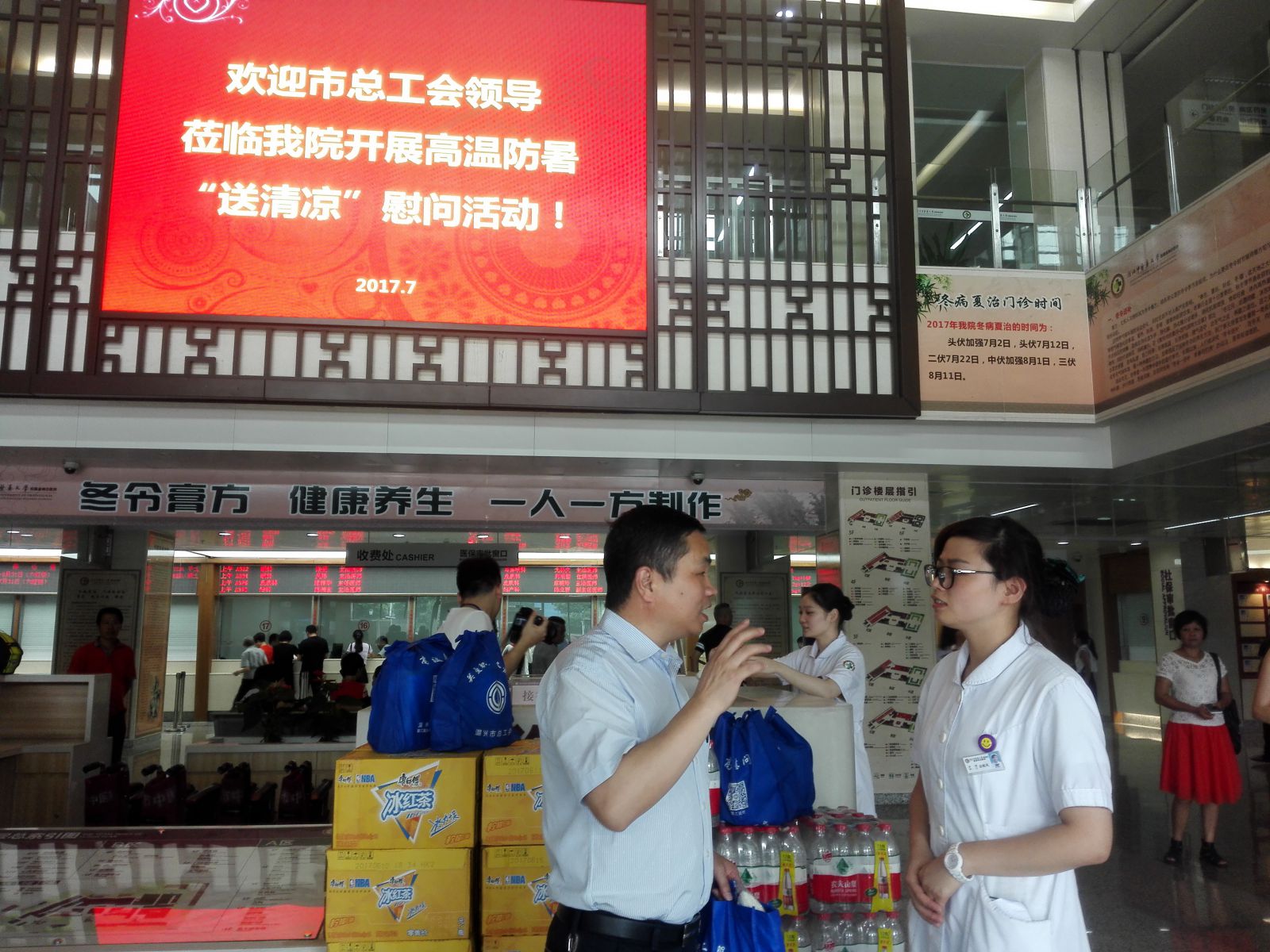 2017年7月18日,温州市总工会副主席李云中,党组成员朱为帆,经济部副部长陈亮等一行来我院开展防暑降温“送清凉”活动,为我院在酷暑中坚持工作的劳动者送上防暑降温慰问品。