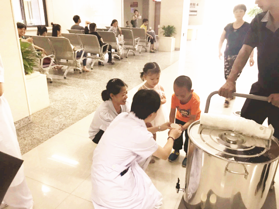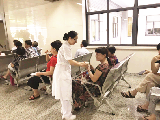 8点30分,医院食堂将茯茶送至门诊大厅,门诊护士和物业人员为候诊、候药、候检的患者送上一杯杯伏茶,缓解天气所带来的炎热、烦躁。此举得到了广大患者及家属的称赞,纷纷向门诊及物业人员表达感谢之情。