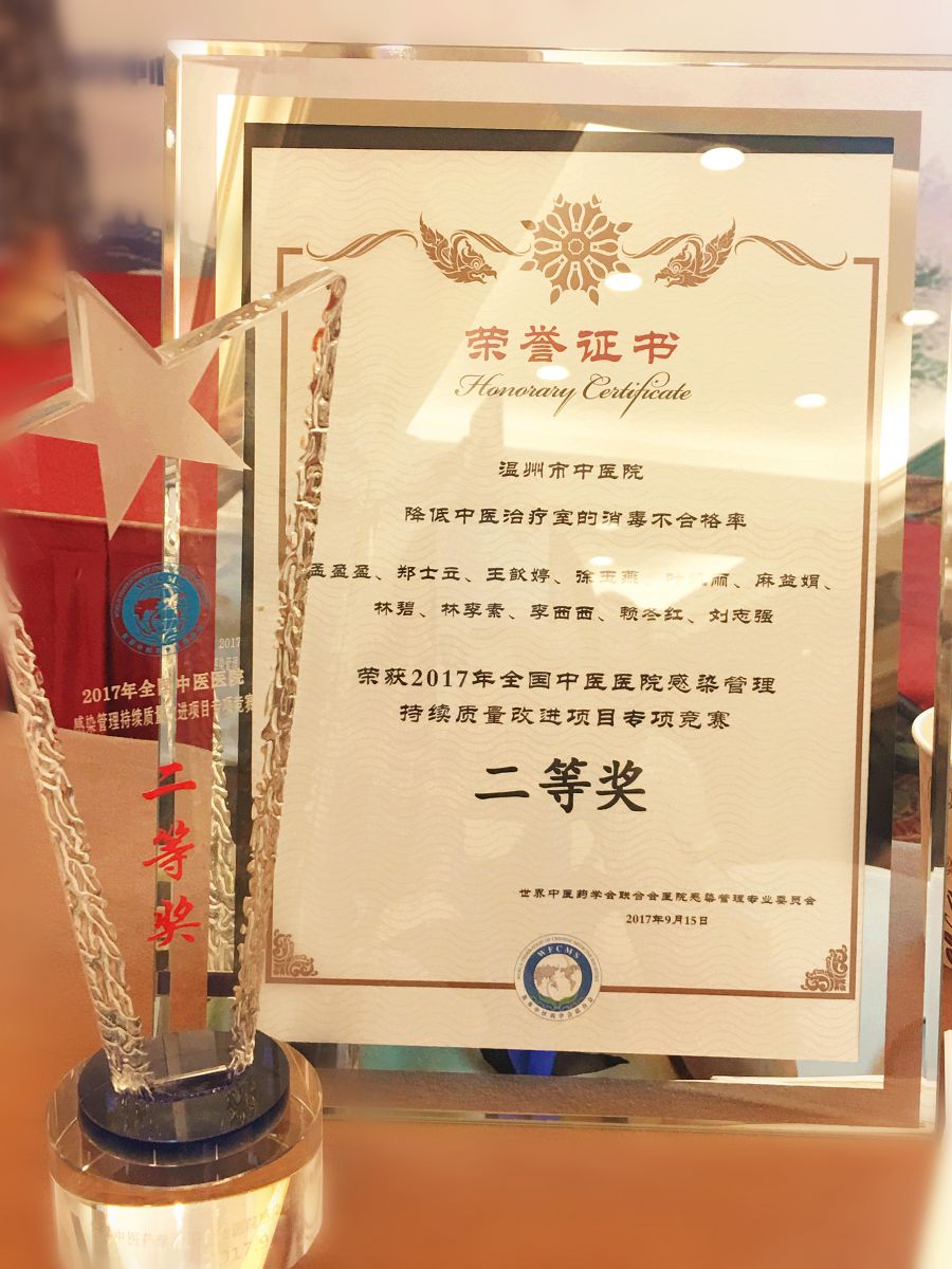 我院感染管理科推送了由针推科医护团队联合消毒供应中心共同完成的《降低中医治疗室消毒不合格率》QCC项目,其主要内容为针推科所有玻璃罐统一送至消毒供应中心集中清洗消毒处理,使玻璃罐消毒得到流程改进和设施改善及评价优化,同时中医治疗室环境清洁消毒、患者皮肤消毒、医护人员手卫生、医疗废物的管理等都得到明显提升。此项目在浙江省中医感染管理PDCA竞赛中成绩突出,不仅入选全国赛,还获得现场汇报资格。在决赛中针推科护士长孟盈盈和护士叶凯丽的亮眼表现、优美的原创歌曲《感控卫士》以及团队项目显著改进成果获得了评委的一致好评,最终荣获全国中医医院感染管理专项竞赛二等奖。